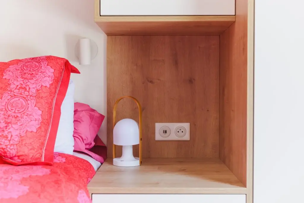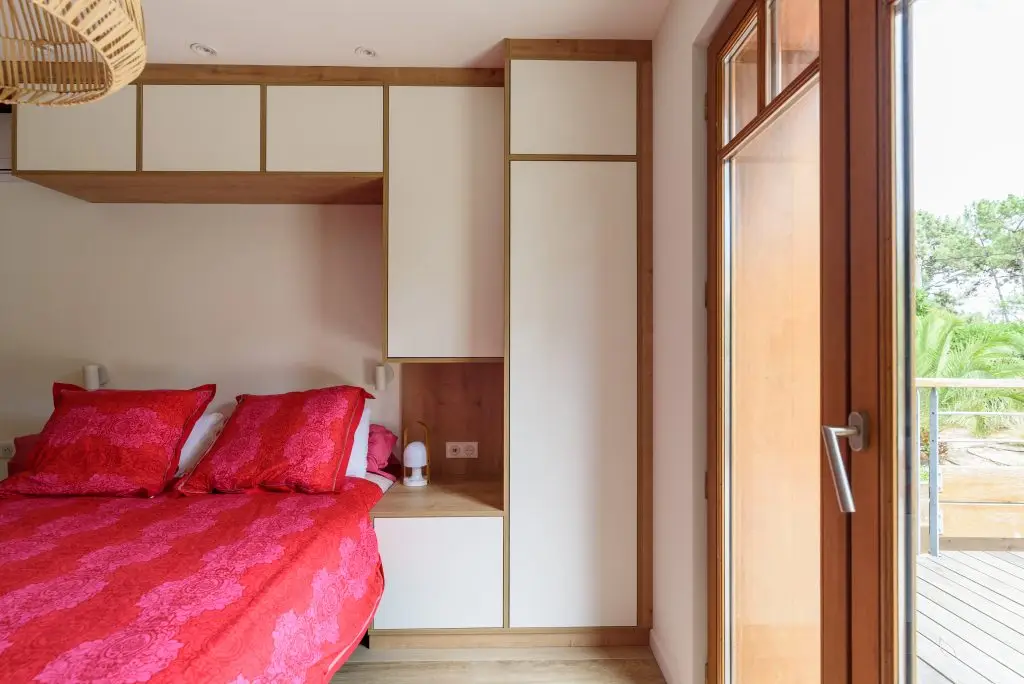 Ce rangement sur-mesure associe la pureté du blanc à la chaleur du bois pour créer un espace à la fois élégant et apaisant dans cette suite parentale. Les façades blanches, sobres et raffinées, apportent une sensation de légèreté et agrandissent visuellement la pièce, tandis que les touches de bois naturel, présentes sur les niches et les étagères, ajoutent une note chaleureuse et accueillante. Chaque module a été conçu pour allier praticité et esthétique, offrant des espaces de rangement bien pensés avec tiroirs, penderies, et étagères ouvertes. Un design équilibré qui transforme la chambre en un véritable cocon, où l’harmonie des couleurs et des matières invite au bien-être et à la sérénité.